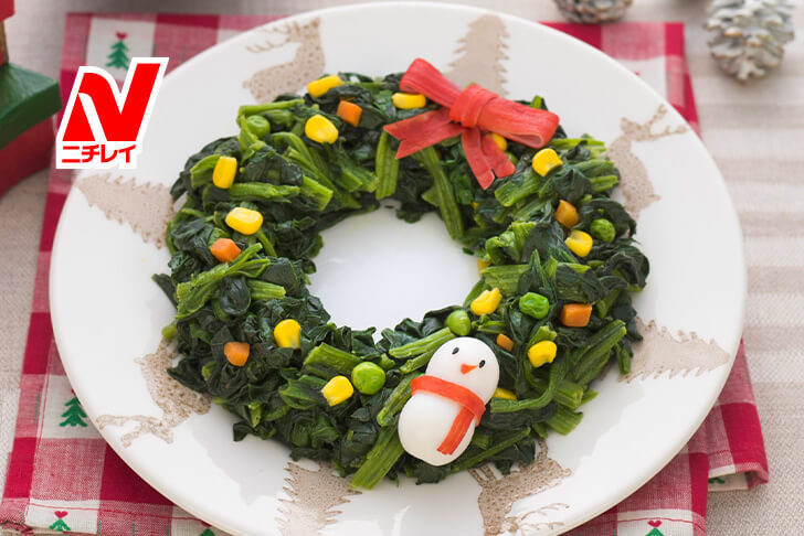 冷凍ほうれん草を使ってサッと作れるのに、リースのような華やかな見た目が食卓を一気にクリスマス気分に。お子さんと一緒に飾りつけを楽しむのもおすすめです。