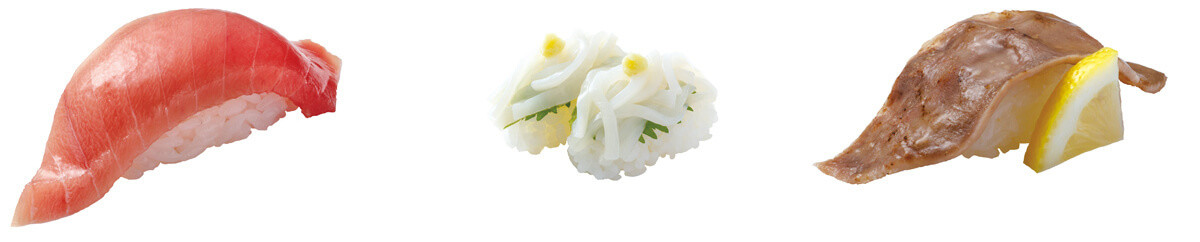 さらに、大葉とおろし生姜の爽やかな風味が真イカの甘みを引き立てる「大葉真いか握り」、シャリに合うよう特製ダレで焼き上げた「炙り豚たん」を100円(税込110円)で販売します。