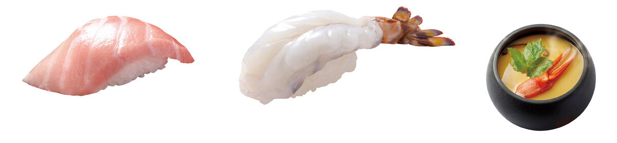▲地中海産 本鮪(まぐろ)大とろ290円(税込319円)/車えび290円(税込319円)/2種のずわいがにの贅沢茶碗蒸し330円(税込363円)