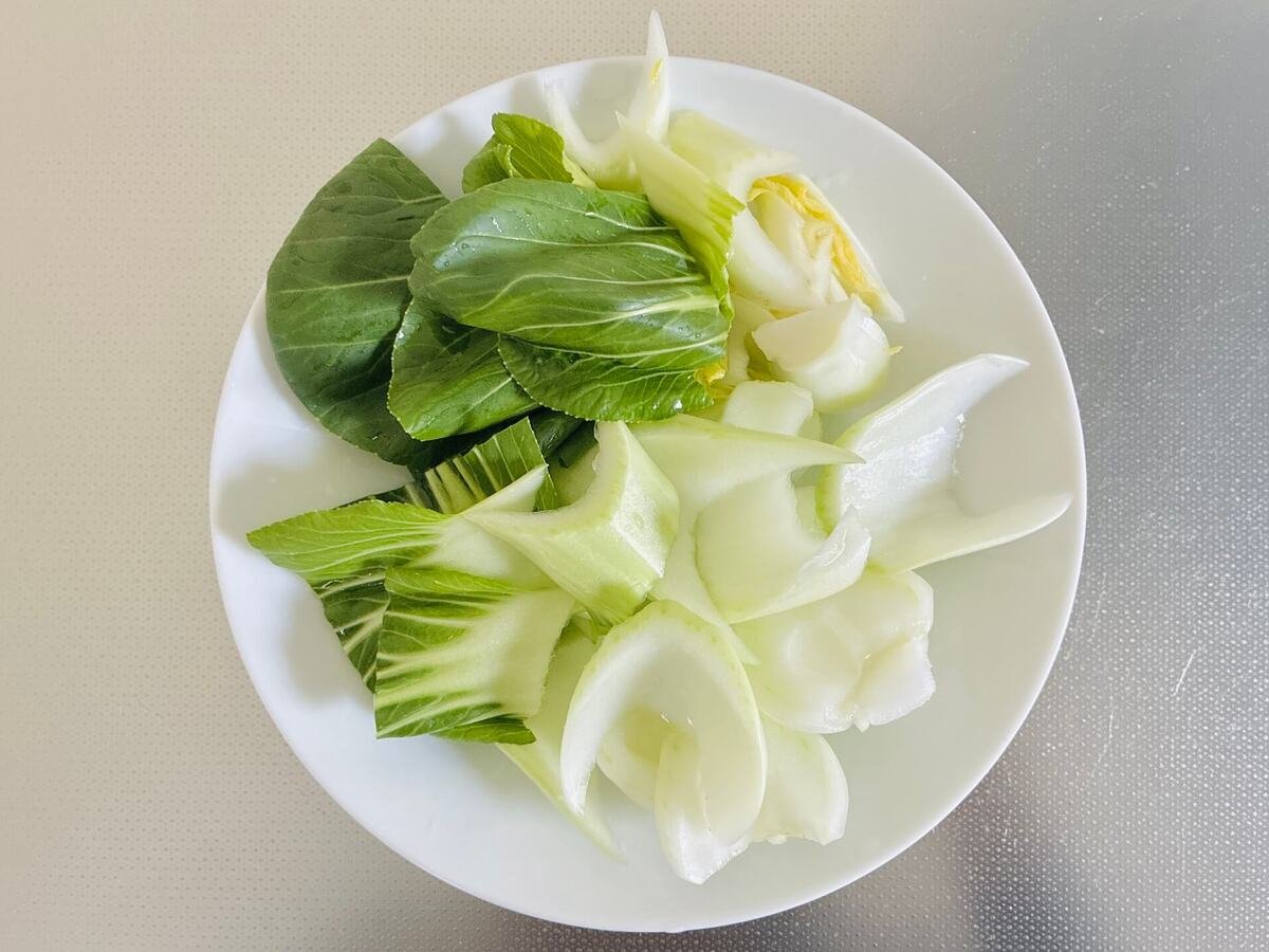 チンゲン菜は食べやすい大きさに切ります。