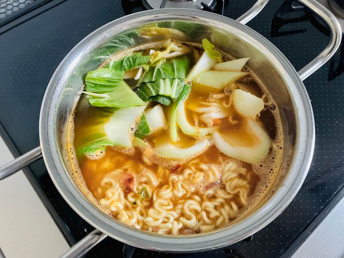 作り方③鍋で辛ラーメンとチンゲン菜を煮る