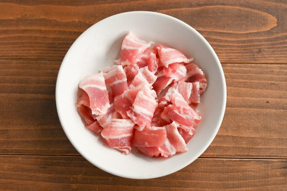 豚バラ肉は食べやすい大きさに切ります。