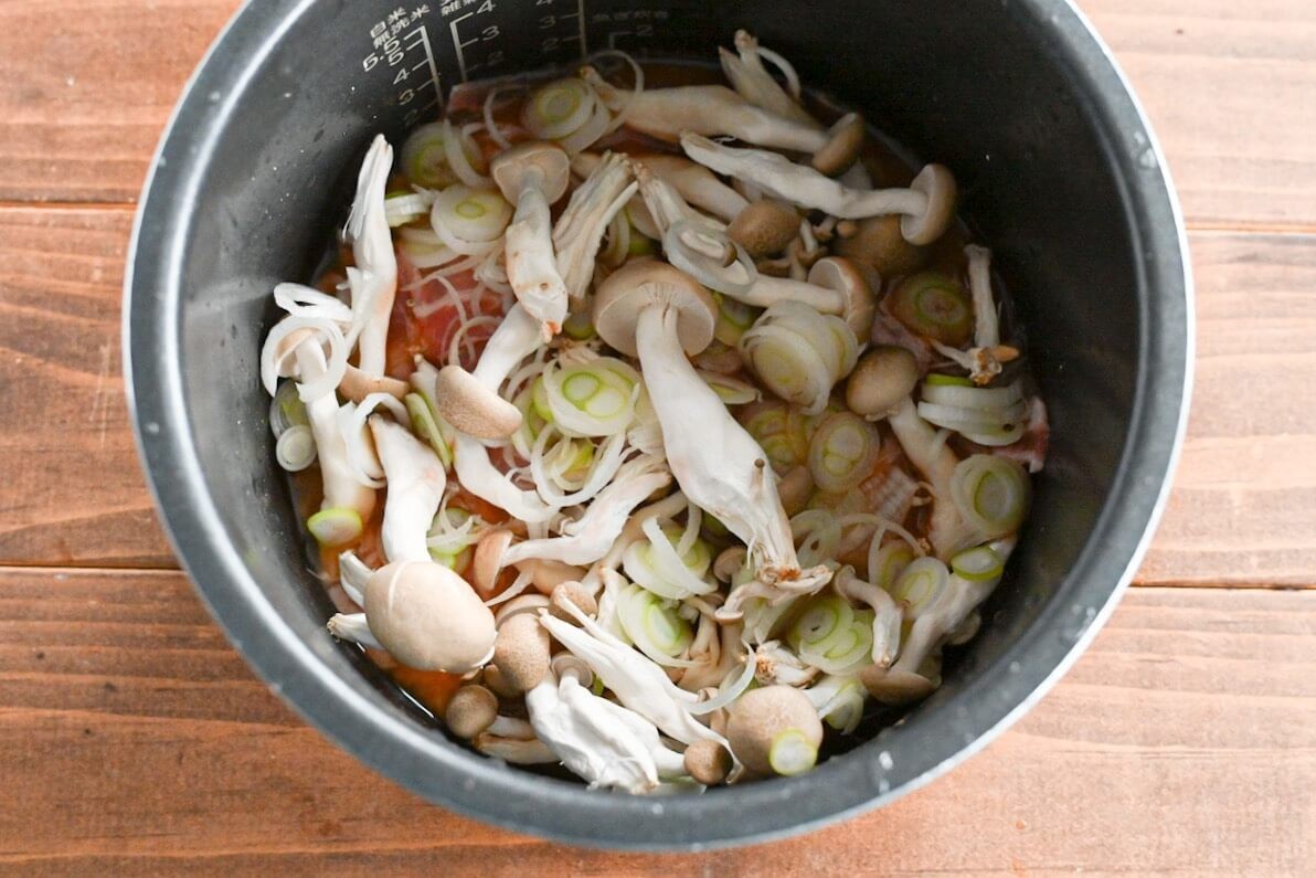 米の上に豚バラ肉、長ネギ、しめじをのせます。