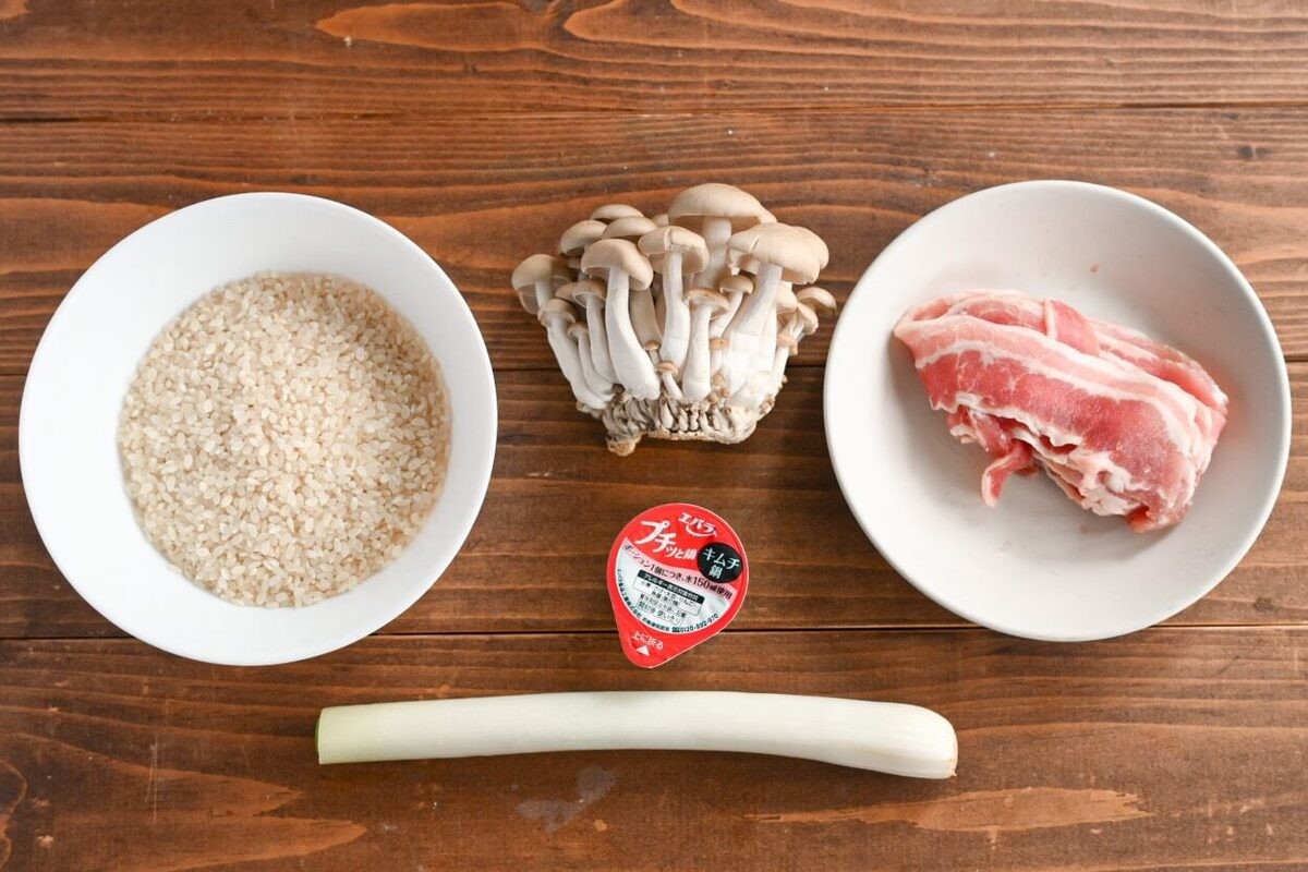 炊飯釜に米を入れ、「プチッと鍋 キムチ鍋」を入れます。
