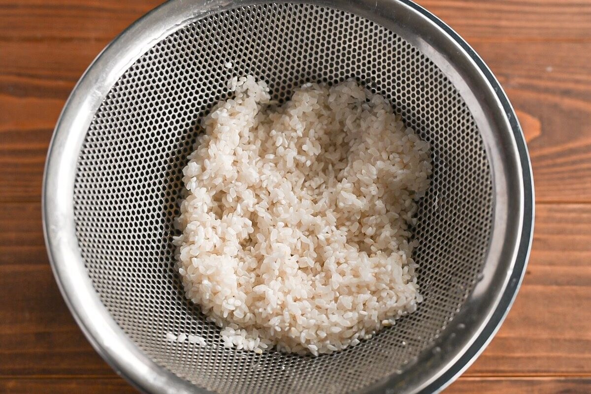 米を研ぎ、ザルに上げます。
