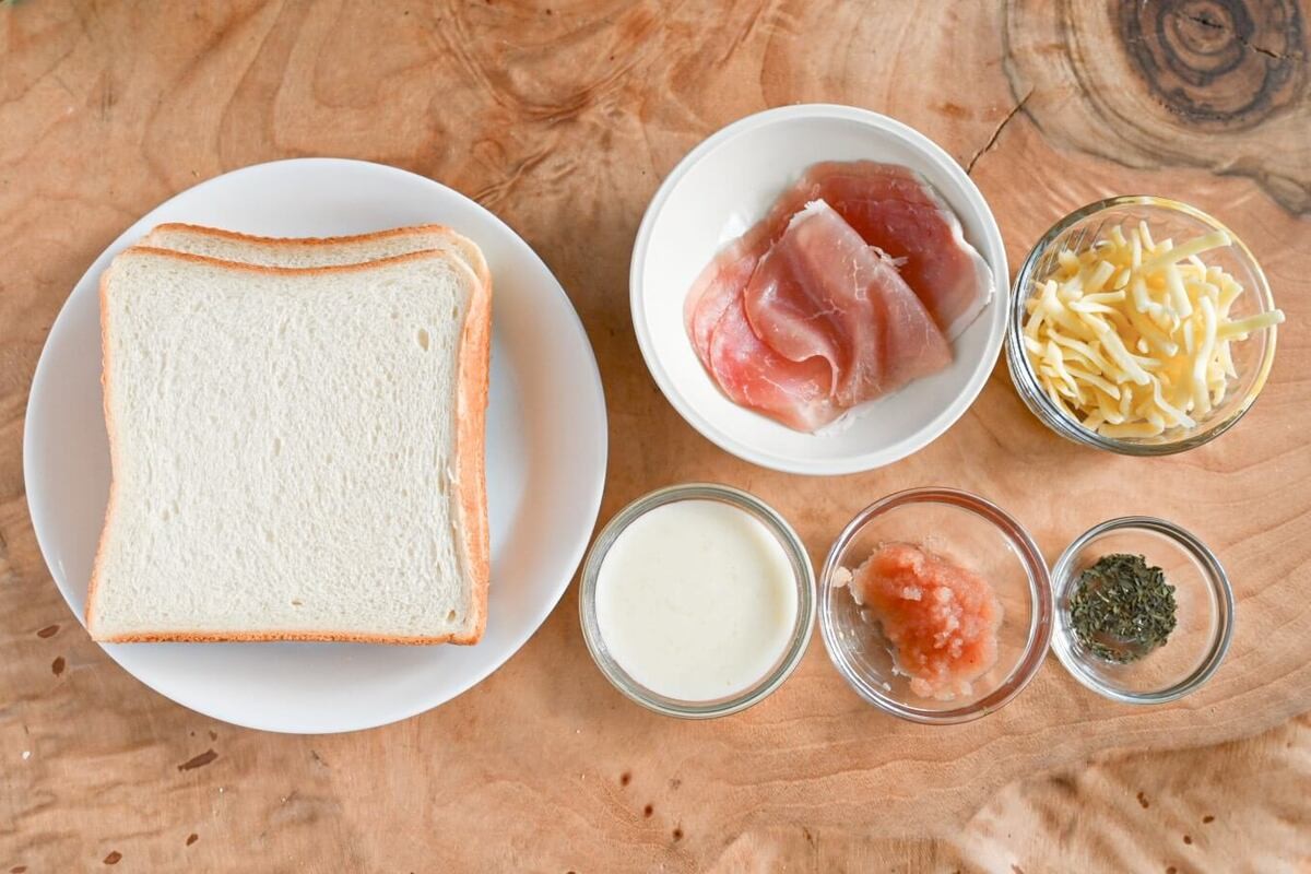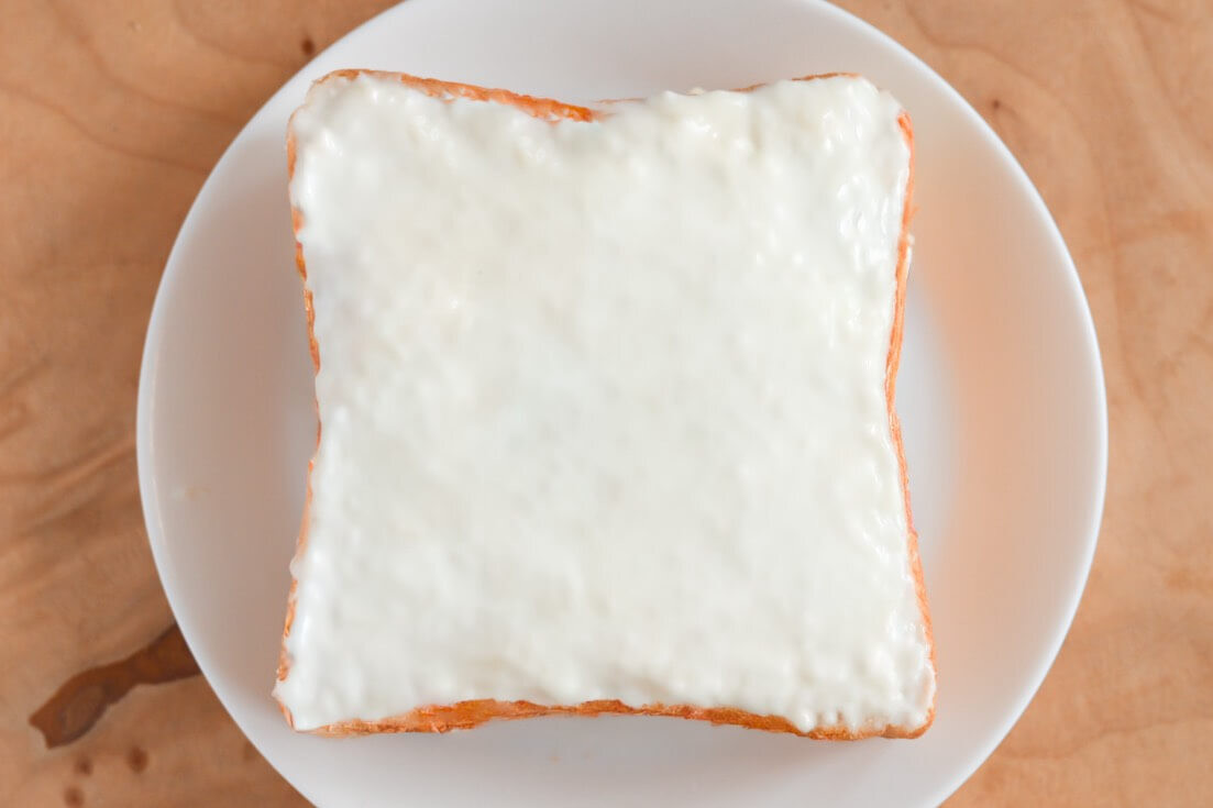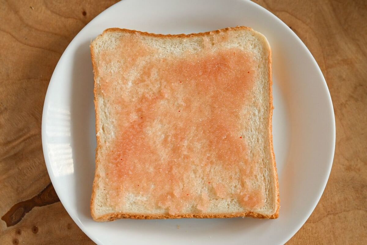明太子で有名な「かねふく」の公式レシピでは、普通の食パンに具材をのせて加熱するだけで完成。
