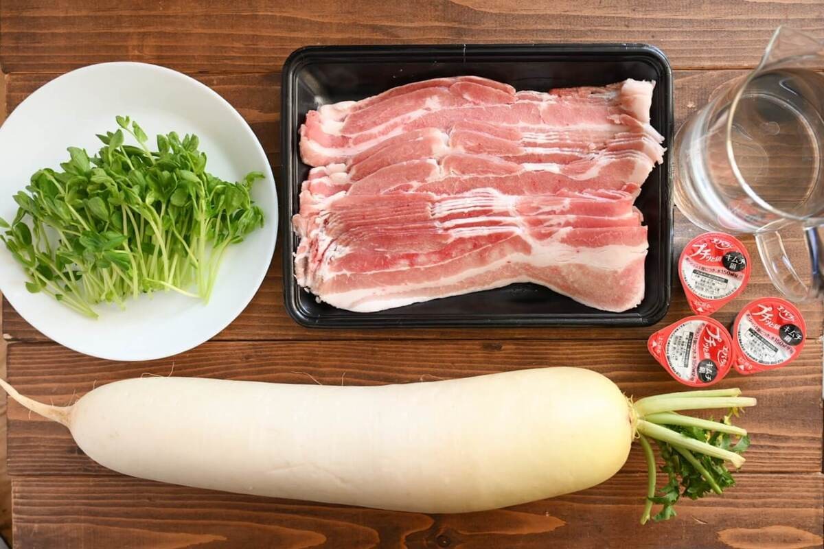 大根は厚さ5mmの輪切りにします。豆苗は根元を切り落としてざく切りにしましょう。