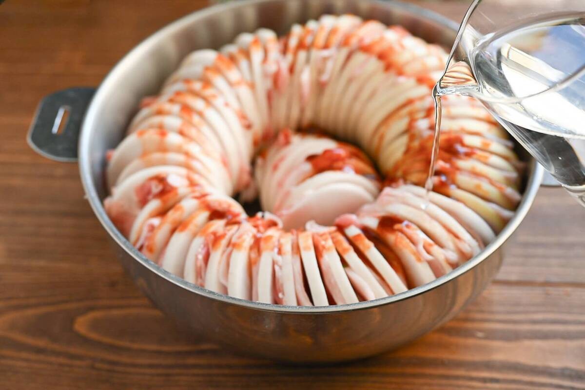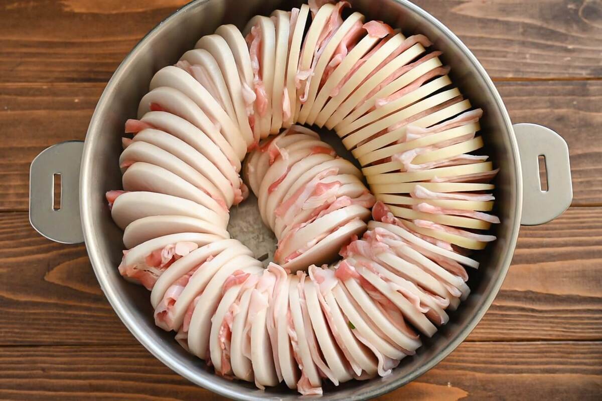 鍋に、①の大根と豚バラ肉を交互に並べます。