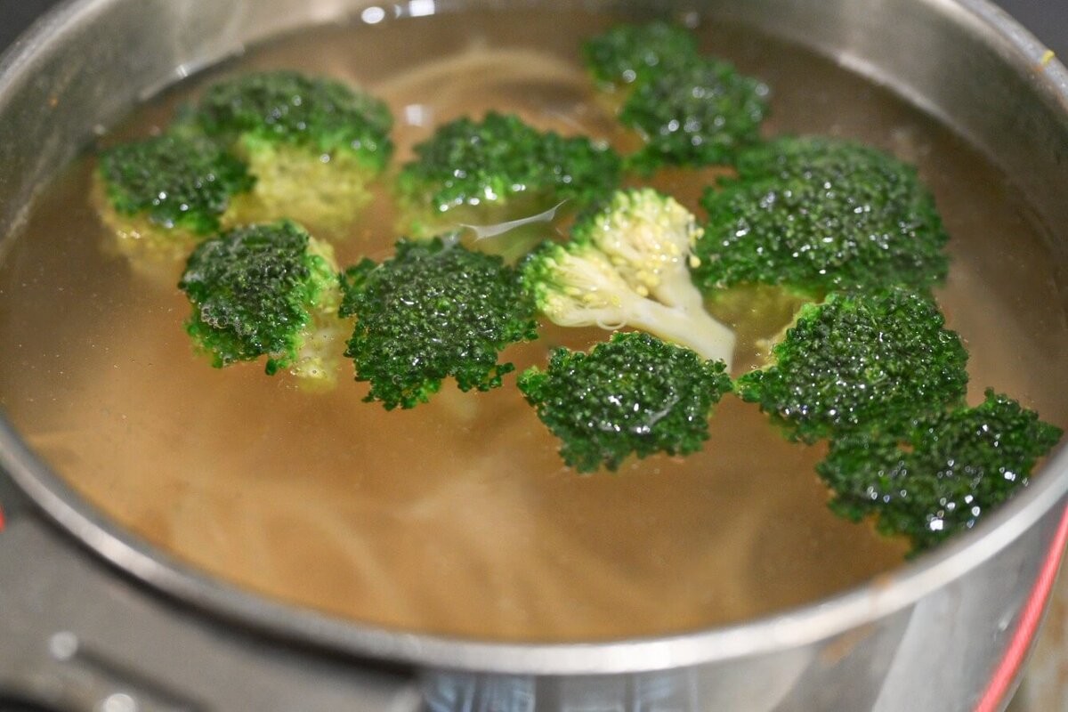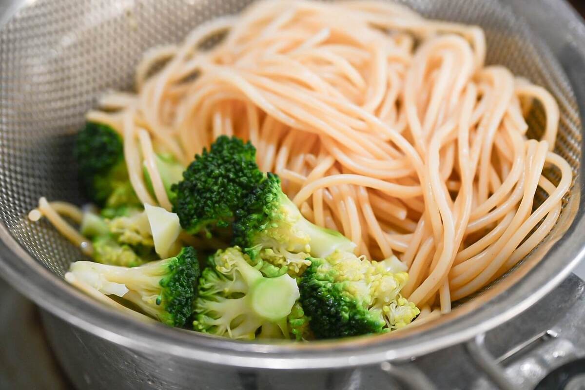 パスタの茹で時間が残り2分になったら、鍋にブロッコリーを入れてパスタと一緒に茹でます。