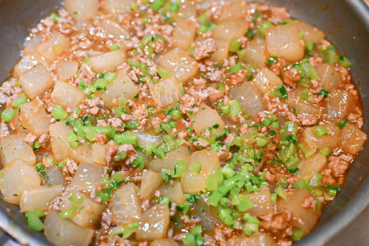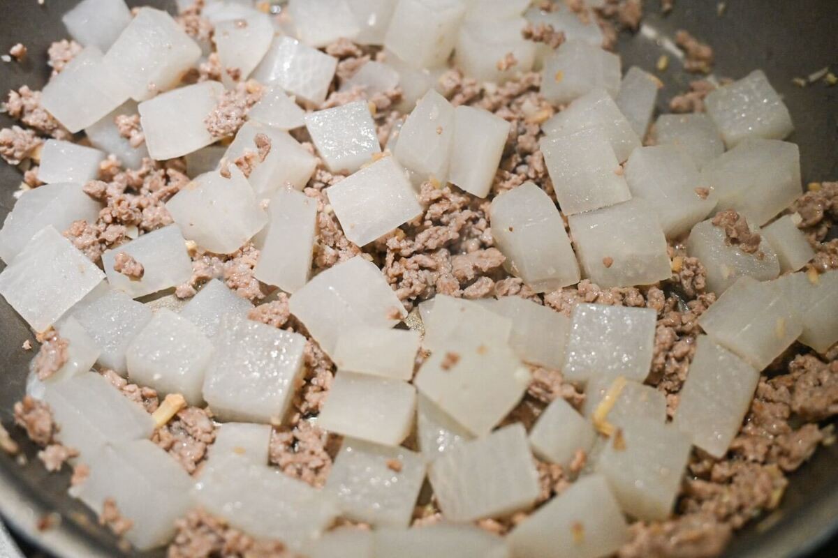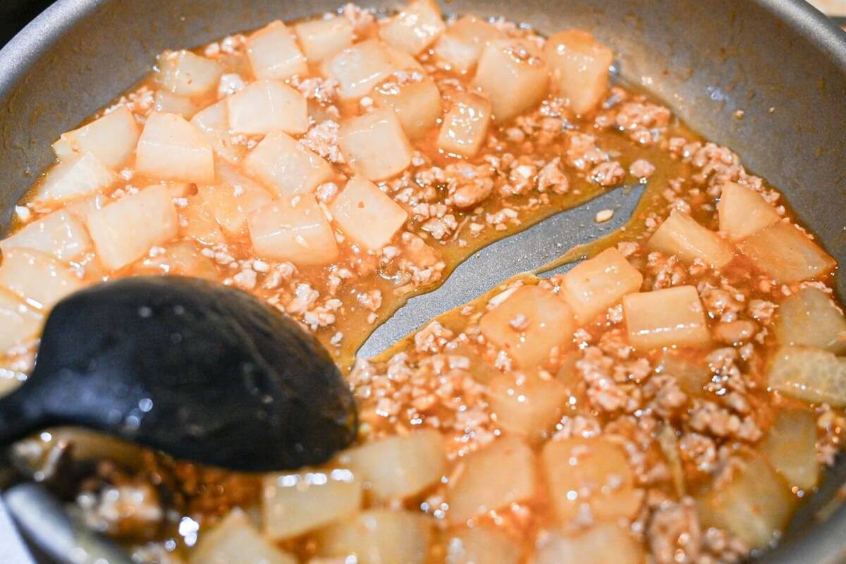 豚ひき肉の色が変わったら大根を加えて炒めます。