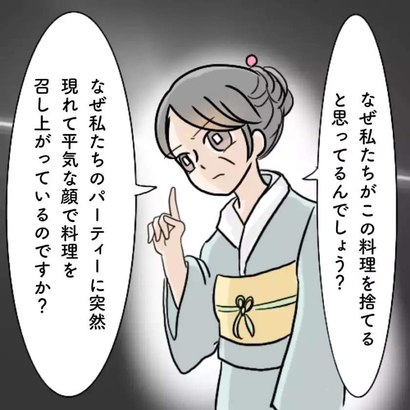 呼ばれてもいないパーティーにズカズカと入り込み、タダでご馳走を食べた挙句、ケーキがもらえないことにキレまくるアカリさん親子のせいで、楽しいはずのパーティーはぶち壊し……。