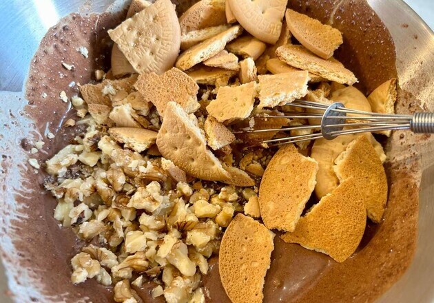 作り方②割ったマリービスケットと砕いたくるみを加える