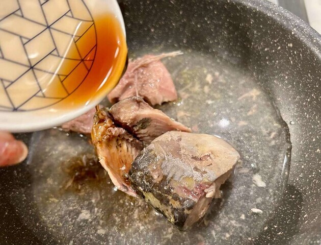 フライパンにサバ缶を汁ごと入れ、めんつゆ、水を加えます。
