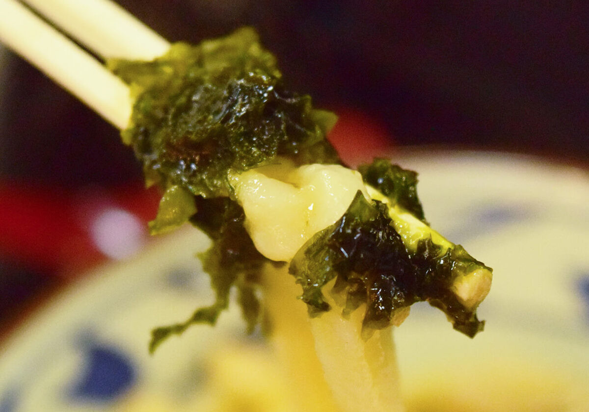 だしはあっさりとした口当たりの醤油系の味わいで、そこに焼きバラ海苔の香りが重なって旨味がぐっと増しています。中央のバターをしっかり溶かしてからだしを飲んでみると、バターはほどよくコクを加える程度で、しつこさはなく、とても飲みやすい仕上がりですね。