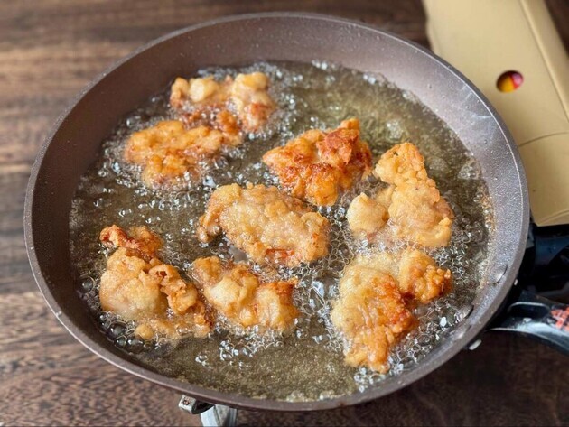 第2陣を揚げる前には、油の温度を下げなければならないため、時間を置く必要があります。どの部位をどれだけ使うかやフライパンのサイズは、計画的に!