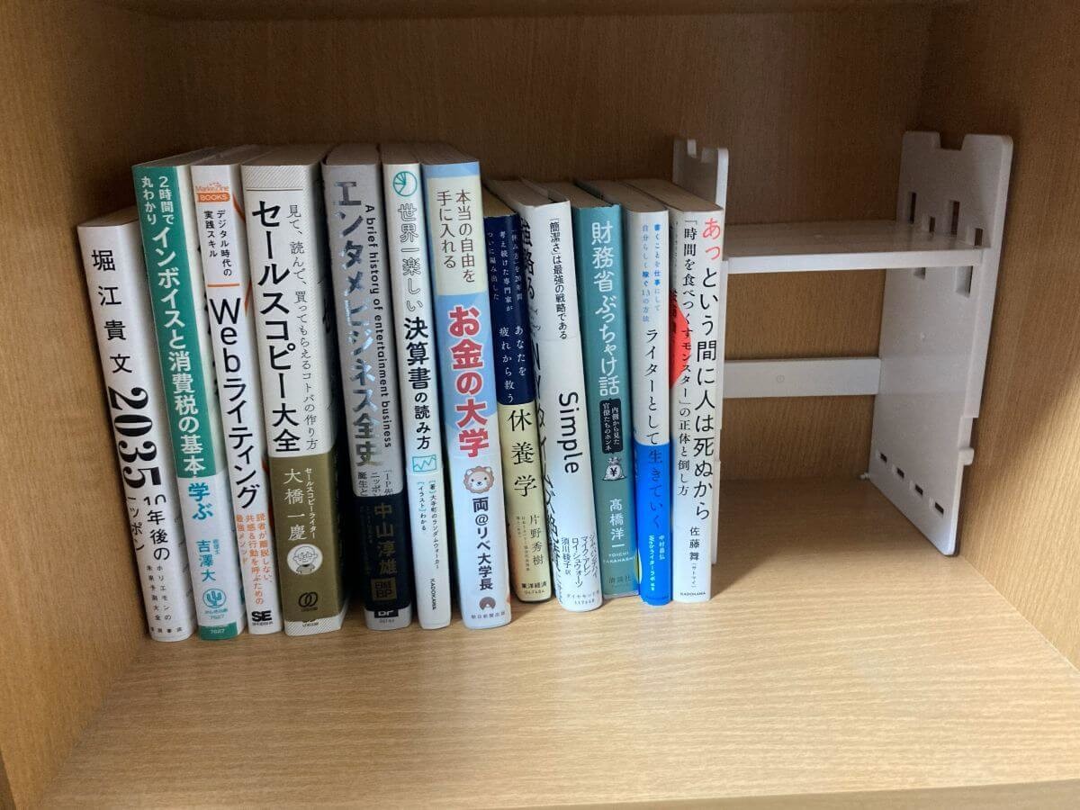 本棚に入れてみるとこんな感じです。パーツが薄いので収納できる本の数に影響がでにくく、本を入れられる量が減った!なんてことも起こりません。