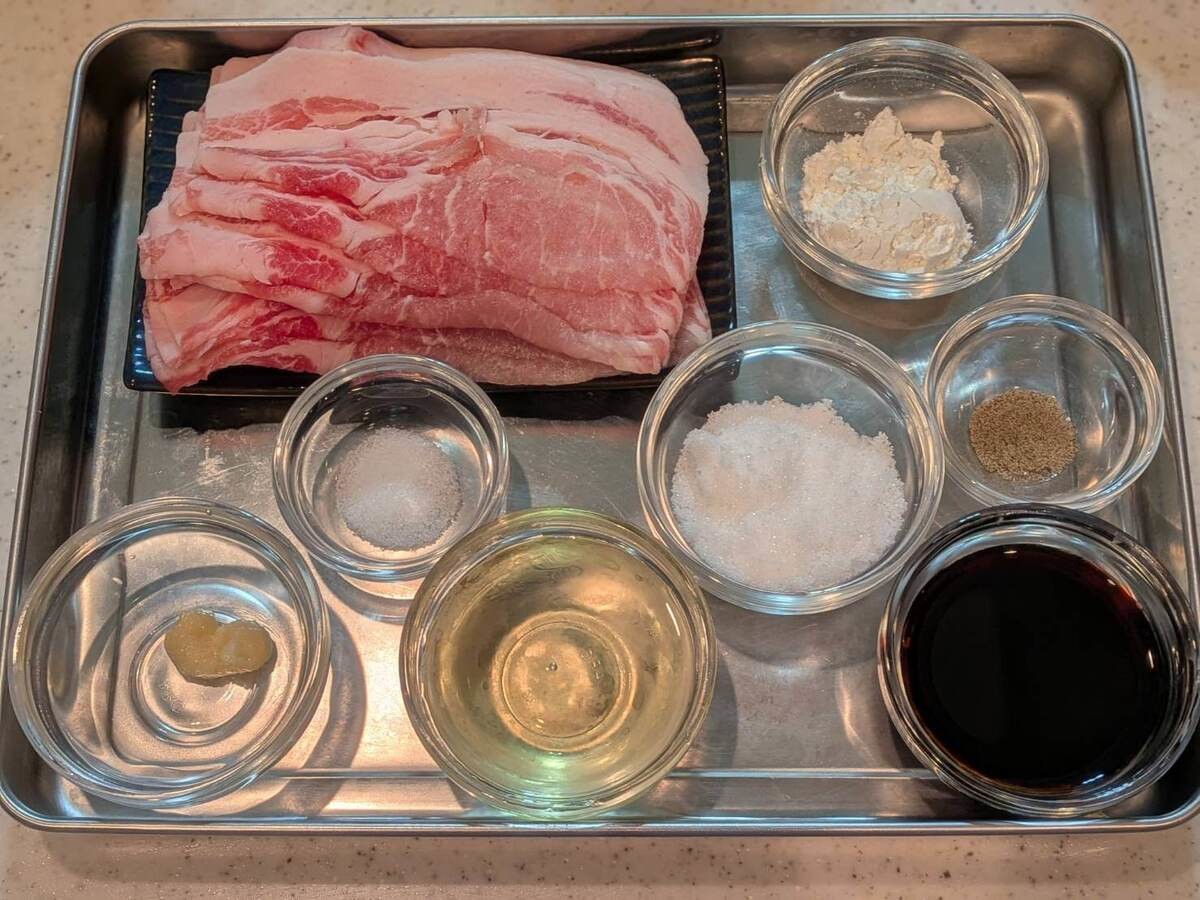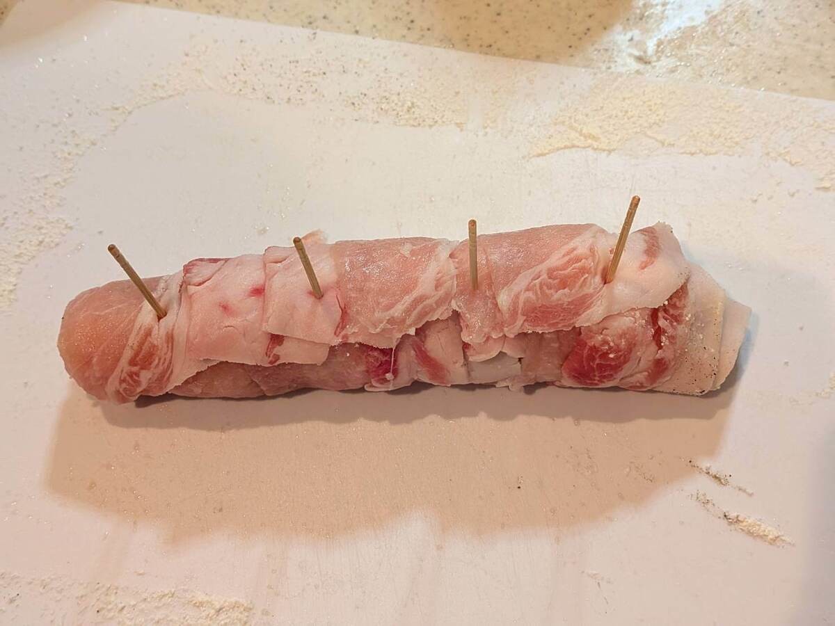 この小麦粉は豚肉同士をくっつける接着剤役です。薄切りの豚肉が、まるでブロック肉のようになる立役者なんです♪