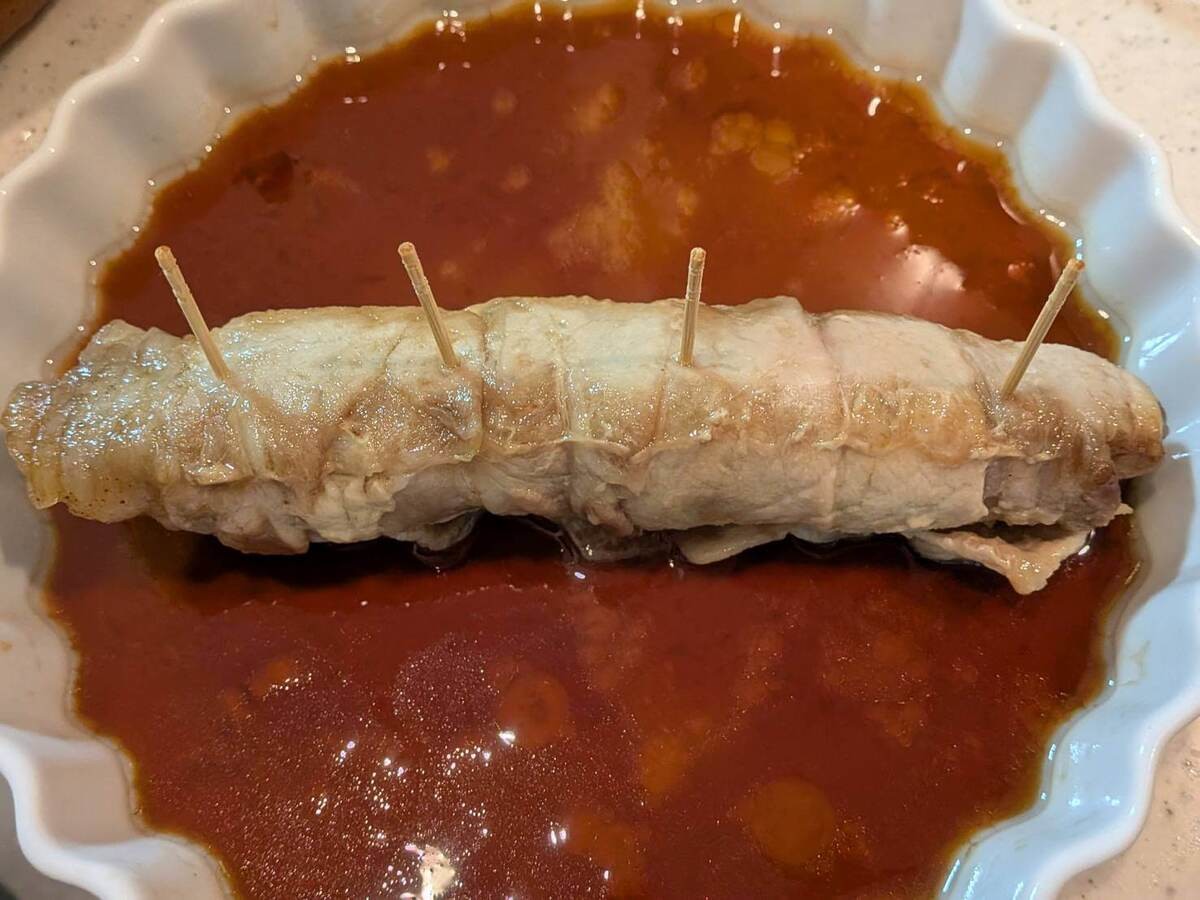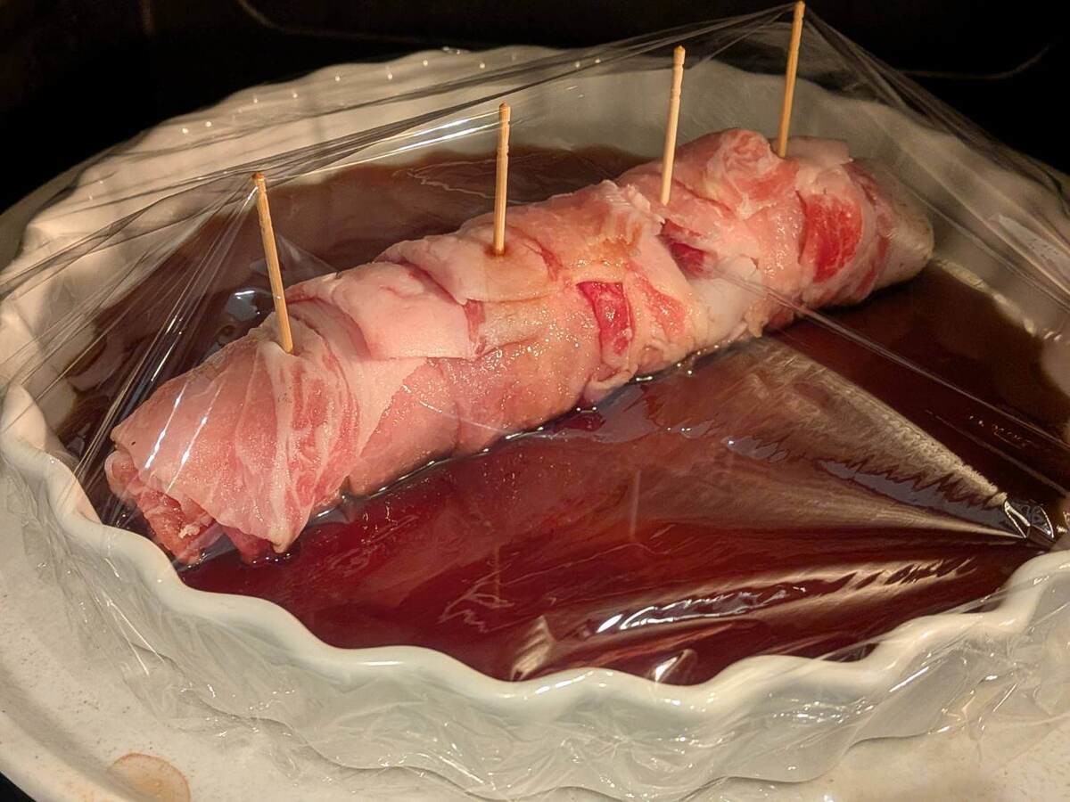 耐熱容器に巻いた豚肉とタレを入れ、上から軽くラップをかけて6分加熱します。