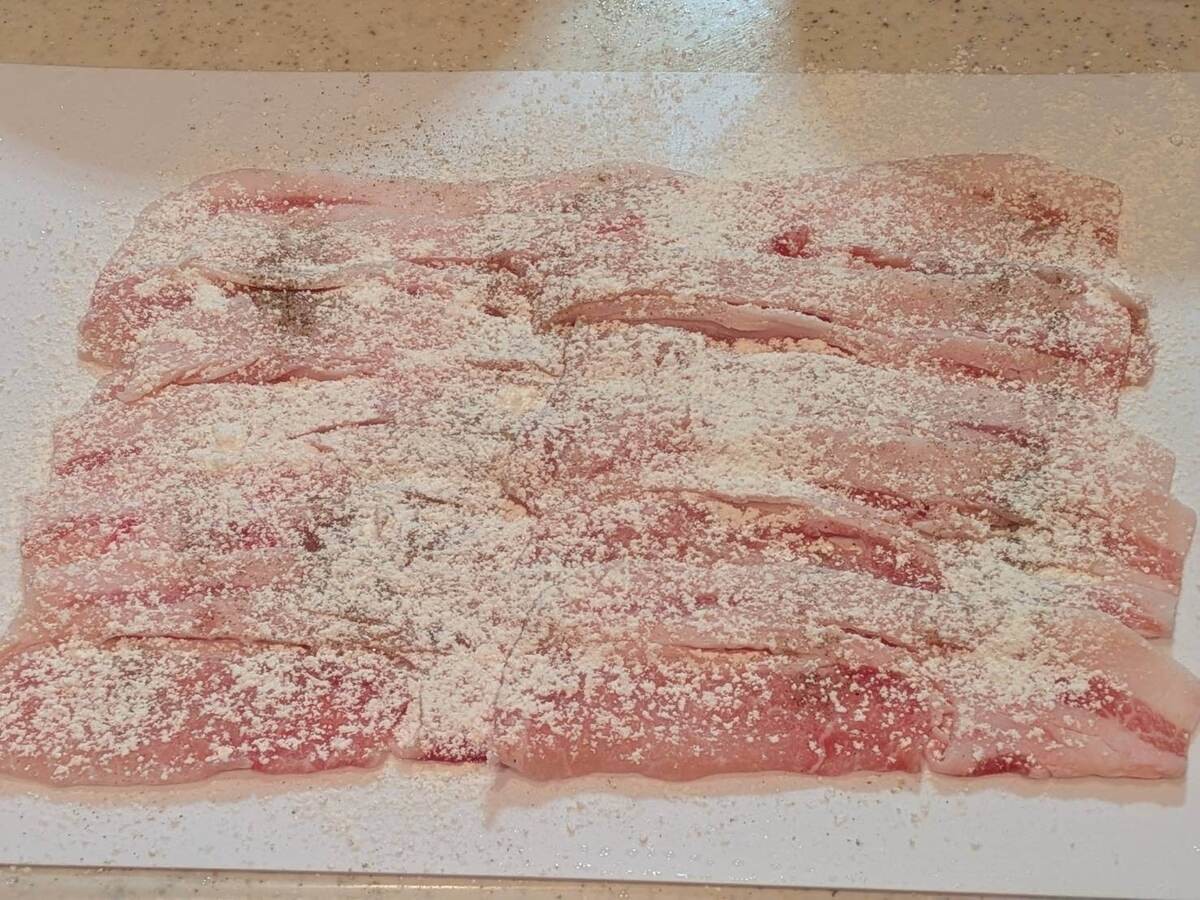 豚肉を半分が重なるように並べ、塩、コショウと小麦粉を振りかけます。