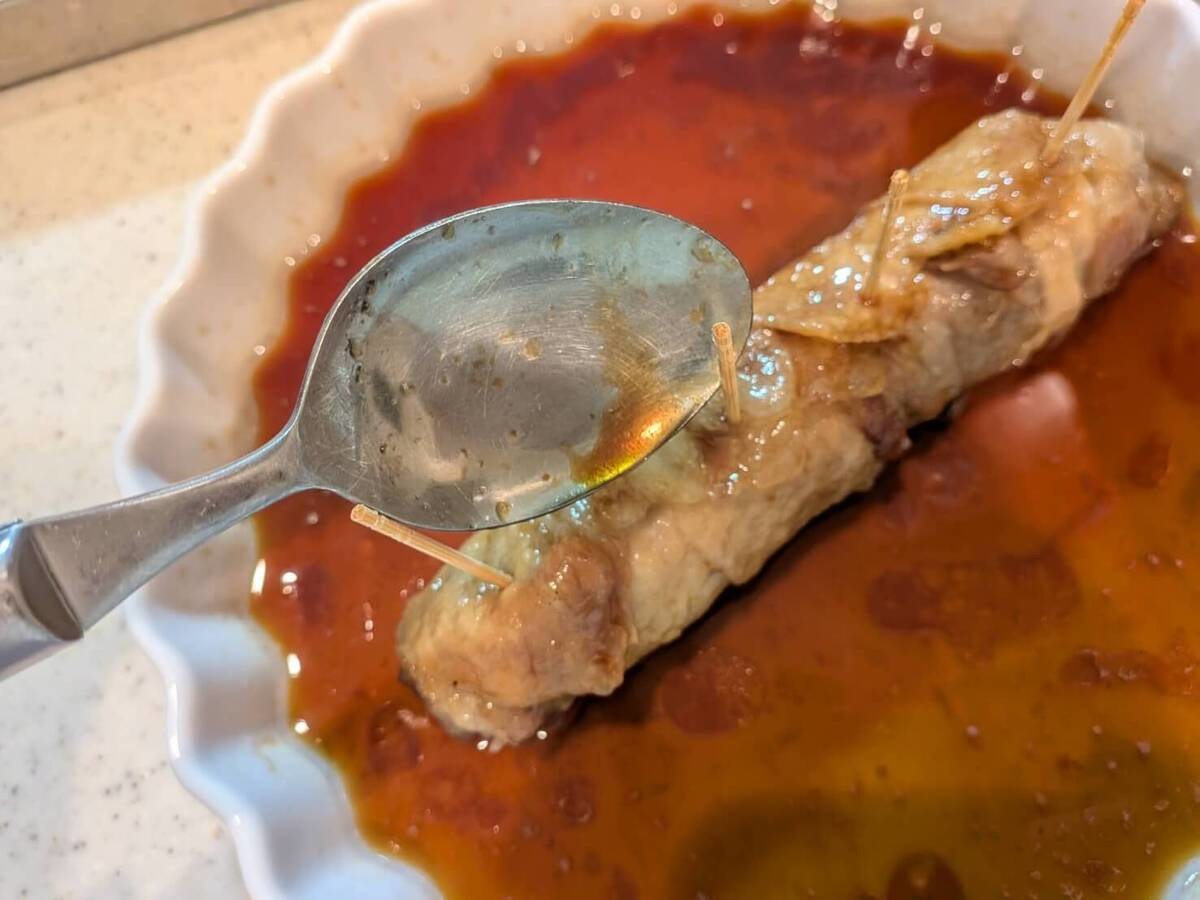 ひっくり返して、ようじを刺し直し、スプーンでタレが染みていないところにもタレをかけて、さらに6分加熱していきます。
