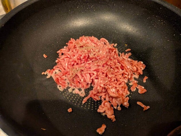 同じフライパンで豚ひき肉を炒め、塩・こしょうを加えます。