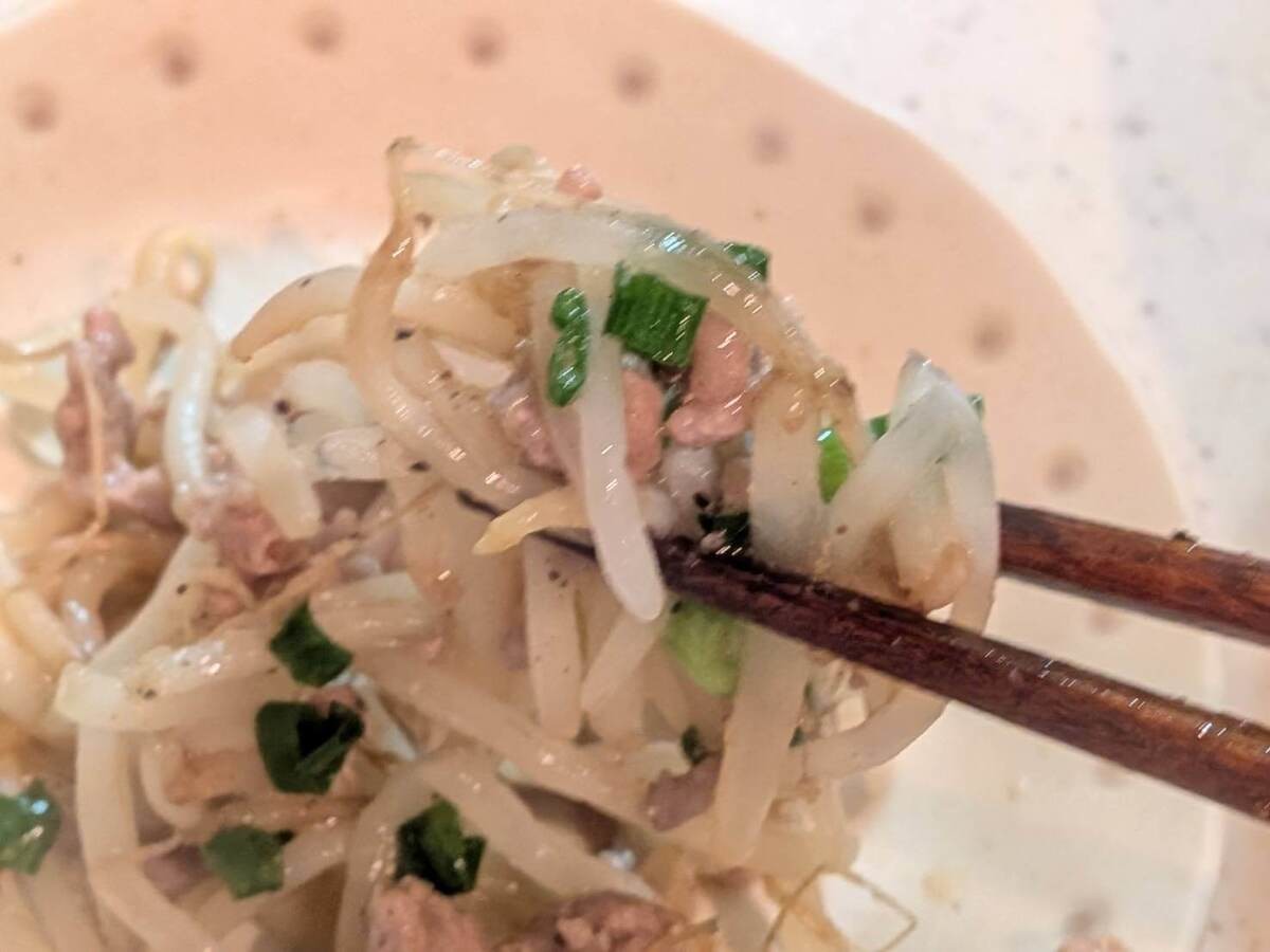 先ほど加熱して取り出しておいたもやしを加え、全体を混ぜたら火を止めます。