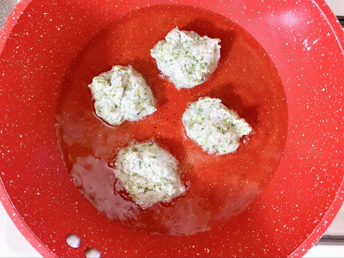 張り付きを防ぐためにスプーンを油にくぐらせ、ピンポン玉大を目安に生地をとります。