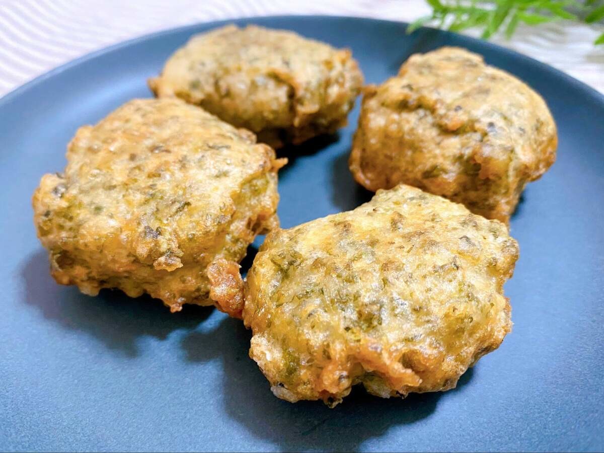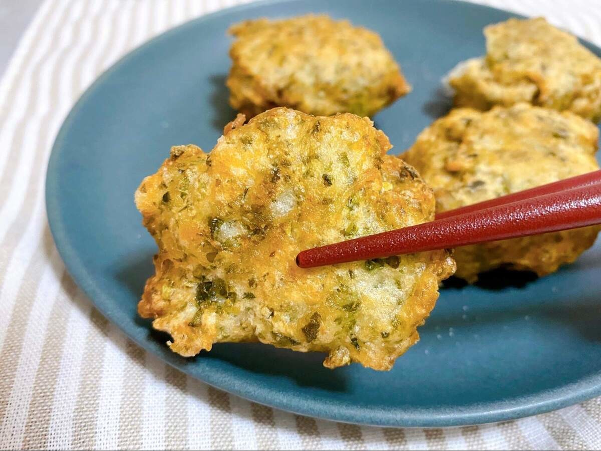 小麦粉とあおさを加え、混ぜ合わせます。公式の投稿に「あおさは多めが美味しい」と記載があったので、画像を参考に大さじ1杯入れました。