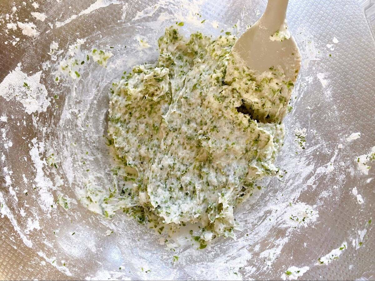 最初は水分が足りないのではと心配になりましたが、お餅を薄くゴムベラで伸ばして、その上に粉類を練り込むようにしていると徐々にまとまってきます。