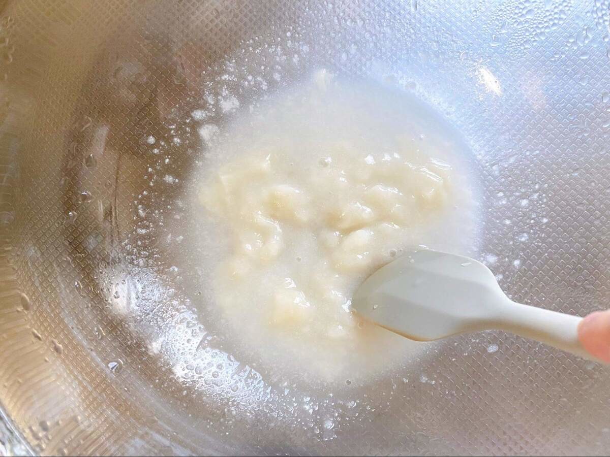 加熱後、切り餅と水が馴染むように泡立て器などでよく混ぜます。今回はゴムベラで切り餅の塊を潰すようにして混ぜました。