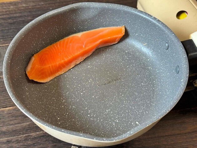 鮭やフライパンの形によってはきれいに沿わせにくいこともあるので、試行錯誤しながら焼いてみてください。
