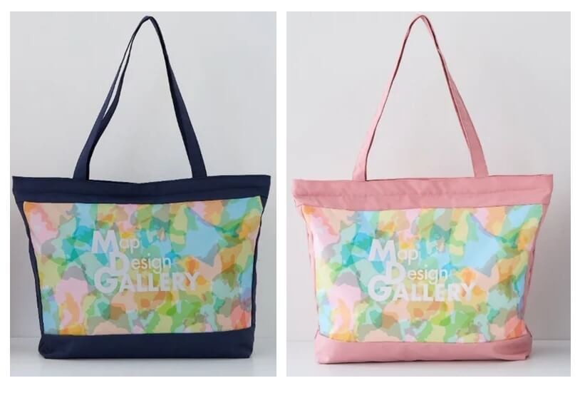 スクエアトートバッグは肩がけと手持ちの2way仕様で地図を大胆にデフォルメしたデザインです。