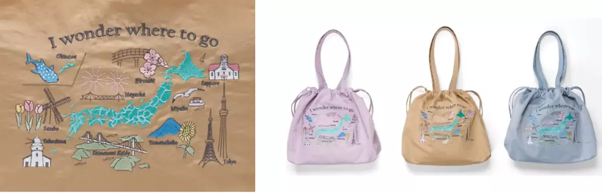 ドローストリングバッグは、日本列島のイラストマップに10エリアの観光スポットの魅力を繊細な刺繍で表現しています。