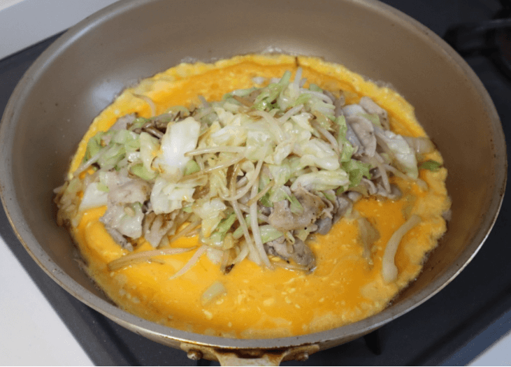 この辺りのタイミングで火加減は弱火にし、卵の表面に火が通ってきたところに、取り出しておいた具材を真ん中にドーン!