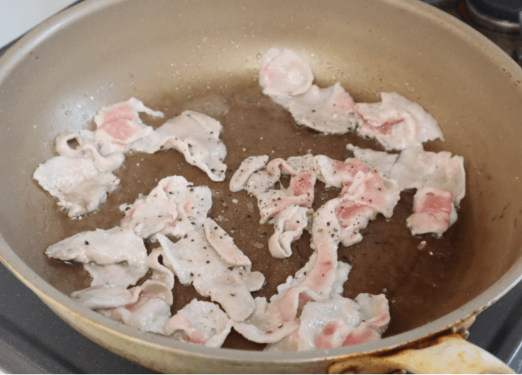 フライパンに油(小さじ1)を入れて中火に熱したら、豚肉を入れて焼き、塩、黒胡椒をふります。