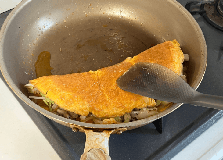 先ほど混ぜ合わせておいた卵液を流し入れて丸く広げ、卵が焦げないようにフライパンを回しながら焼きましょう。