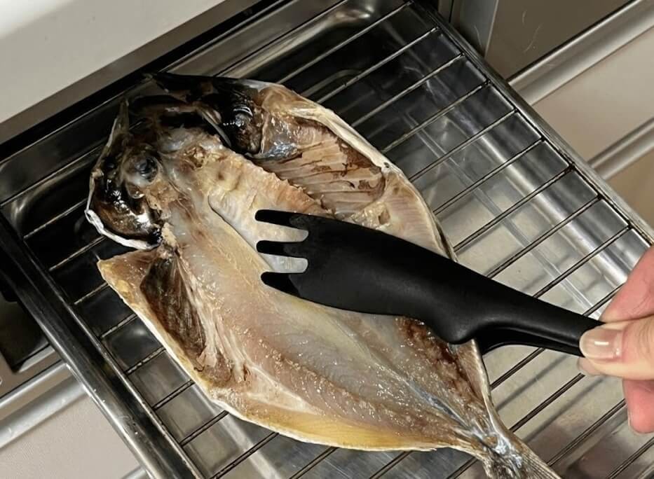 魚焼きグリルの内部は、手前よりも奥の温度が高くなるので、肉厚な頭の方を奥に置くと均等に火が入り干物が美味しく焼けるんだそうですよ♪