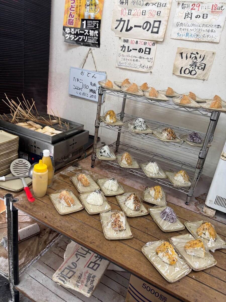 入店後、うどんの注文を店員さんに伝えるまでにまず最初におでんやおにぎり等のご飯系、その他サイドメニューが置いてあるので、食べたい人は取ります。