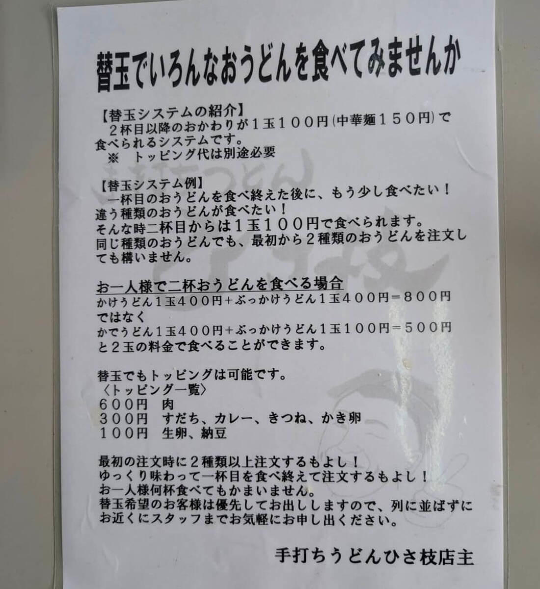ちなみに、うどんだけでなく中華そばでもできます。中華そばの場合は1玉150円です。“替え玉”は、最初に注文したメニューとは別のメニューを注文しても構わないので、一度の来店で2種類のメニューを楽しむことができます。