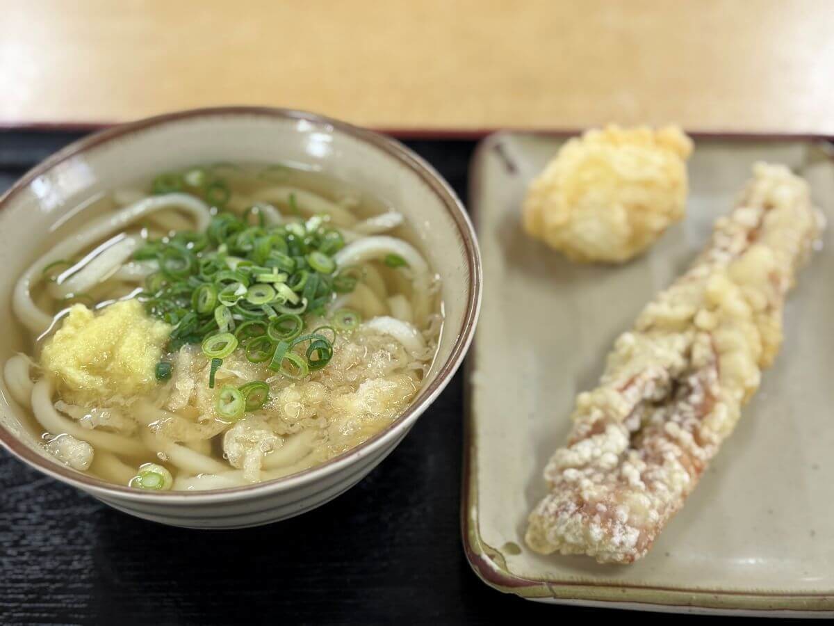 「ちょい鳥天バラシ」という鳥天を一口大にバラシた天ぷらです。ということは、“肉の日”に肉系のうどんを注文すると、ちくわの天ぷらと鳥天バラシ、この2つを“プレゼント”してくれるというわけです!何とも嬉しい限りです。