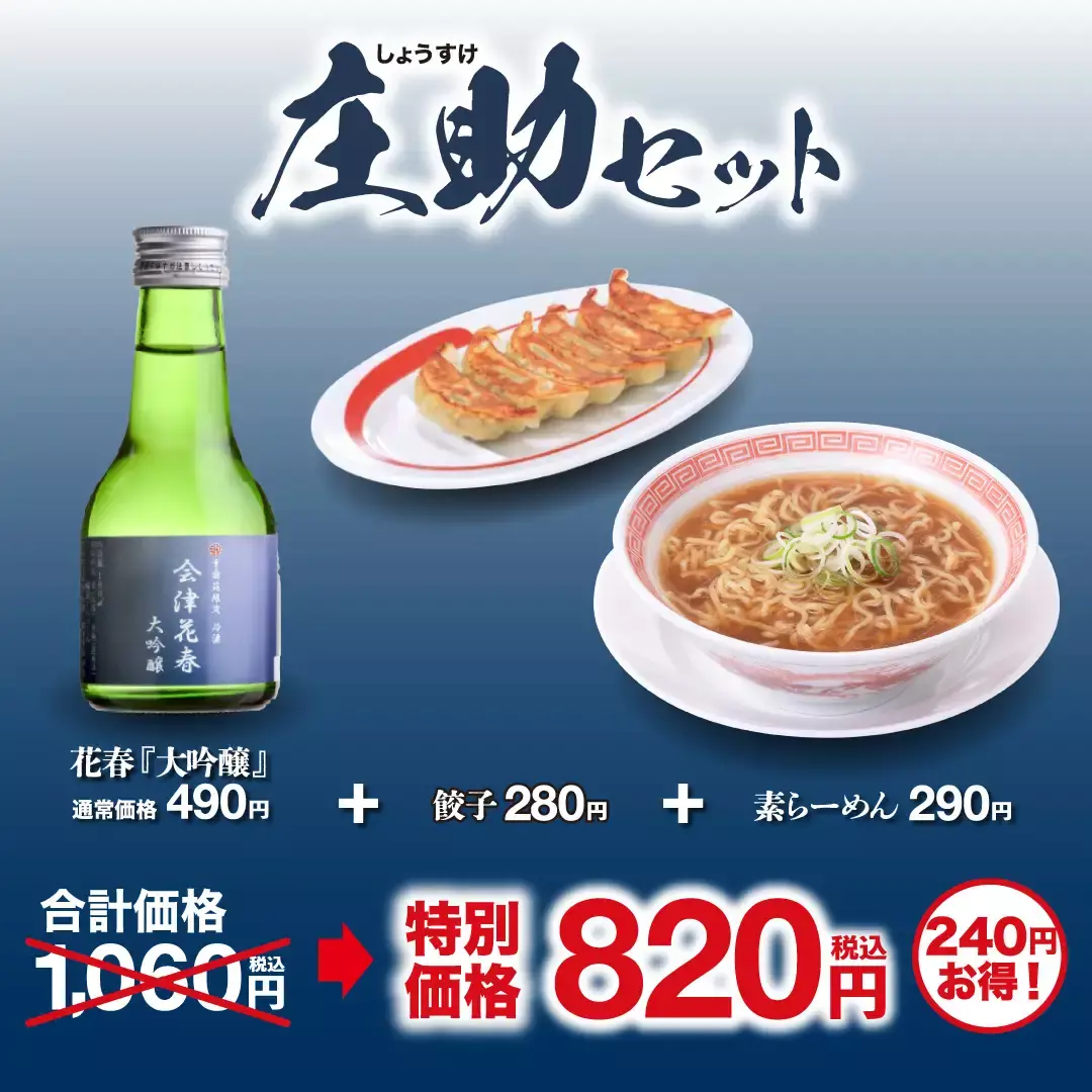 ※会津花春〈大吟醸〉+餃子+素らーめんのセットです。