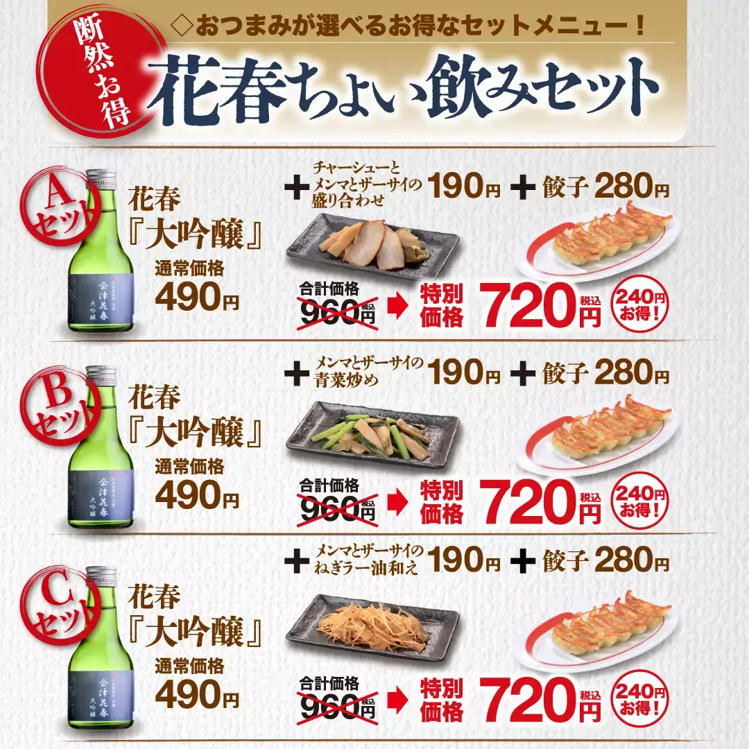 この機会に、是非、幸楽苑で、会津花春〈大吟醸〉とのお得なセットをお楽しみください。