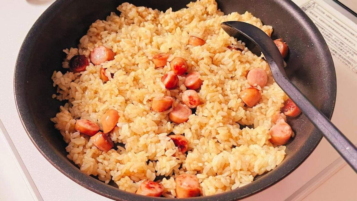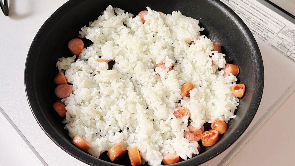 軽く焼き色がついたら、白ごはんを加え1〜2分ほど炒めます。