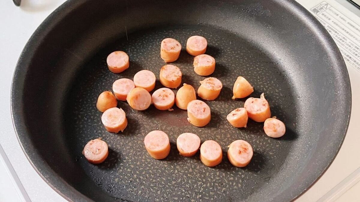 ウインナーを1cm幅に切って、中火のフライパンで炒めます(テフロン加工のフライパンの場合、油は不要です)。