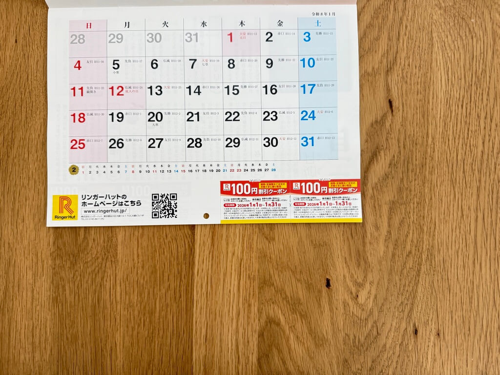 さらにもう1つ忘れてはいけないのが、クーポン付きの「歳時記カレンダー」。カレンダーとして使えるうえに、各月に100円の割引券が2枚付いています。リンガーハット好きにはたまらないアイテムです。