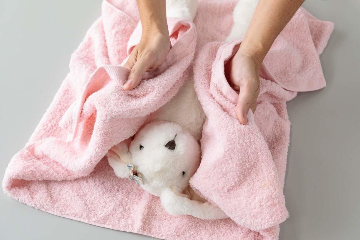 その場合は、型くずれや毛並みの乱れ、目や鼻などプラスチック部分の傷みを防ぐために、バスタオルで包み、洗濯機で30秒~1分ほど脱水します。