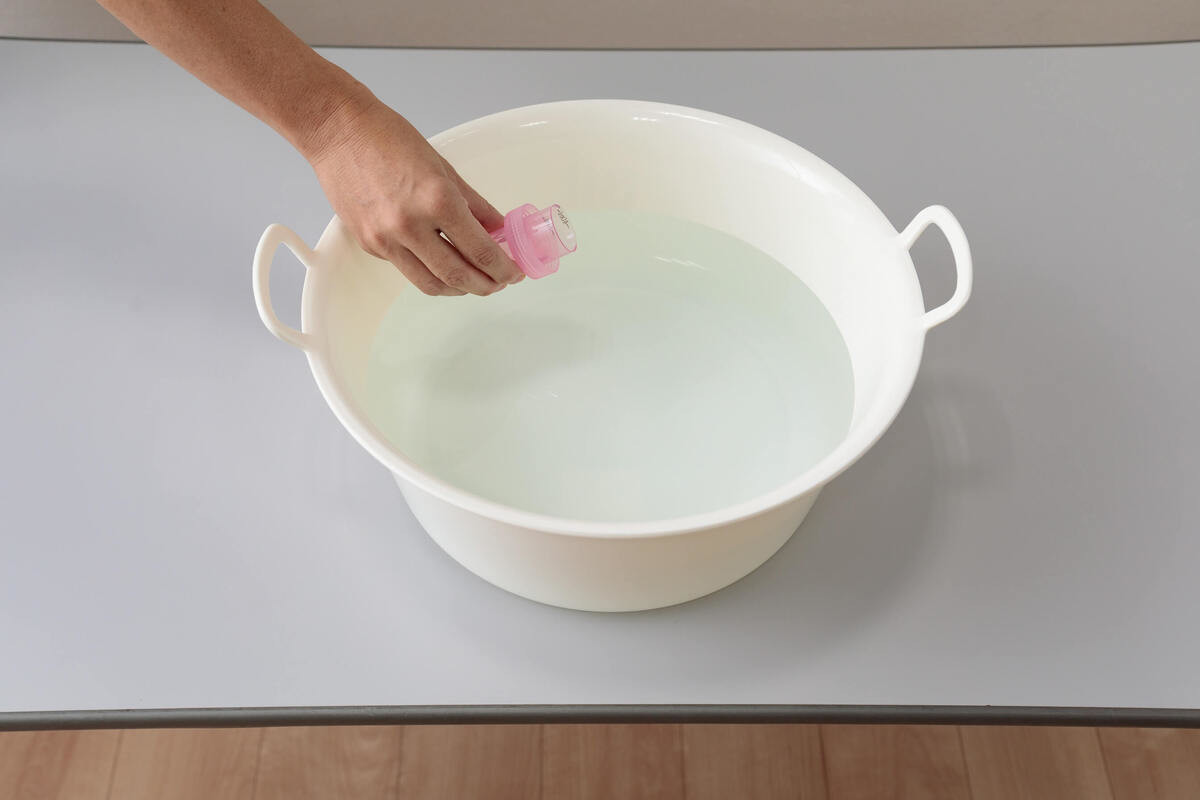 洗剤液は、洗濯おけなどにおしゃれ着用洗剤を水に溶かしてつくります。分量は、標準使用量の半量(アクロンの場合、水4Lに対して洗剤5mL)が適量です。