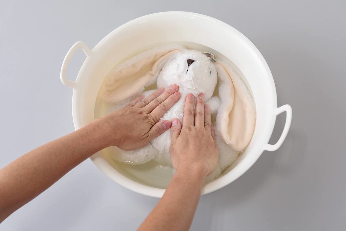 ぬいぐるみを洗剤液に浸し、やさしく押し洗いします。汚れが目立つ部分は、洗剤を含ませたスポンジで丁寧にたたき洗いしましょう。