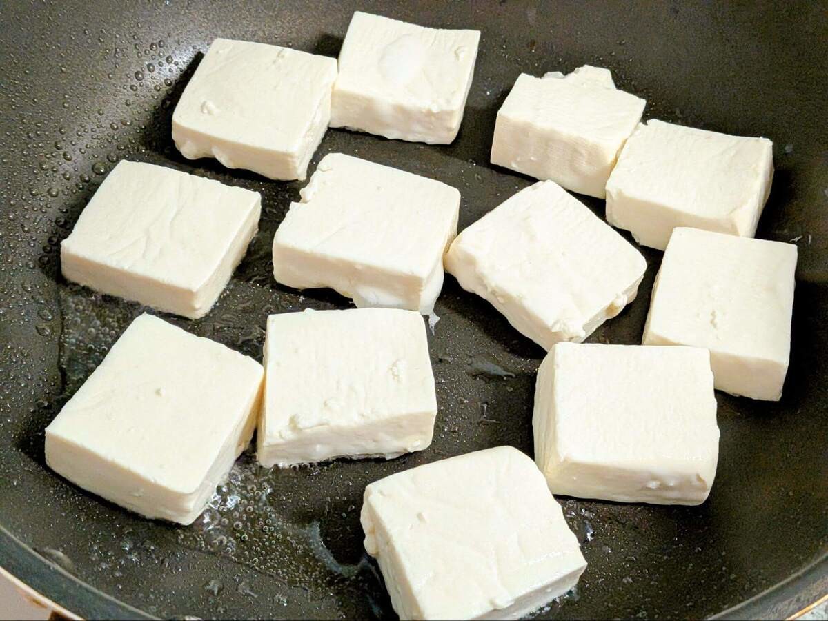 フライパンに油を入れ、豆腐を焼きます。元レシピには記載がありませんでしたが、片栗粉をまぶした方から焼きました。