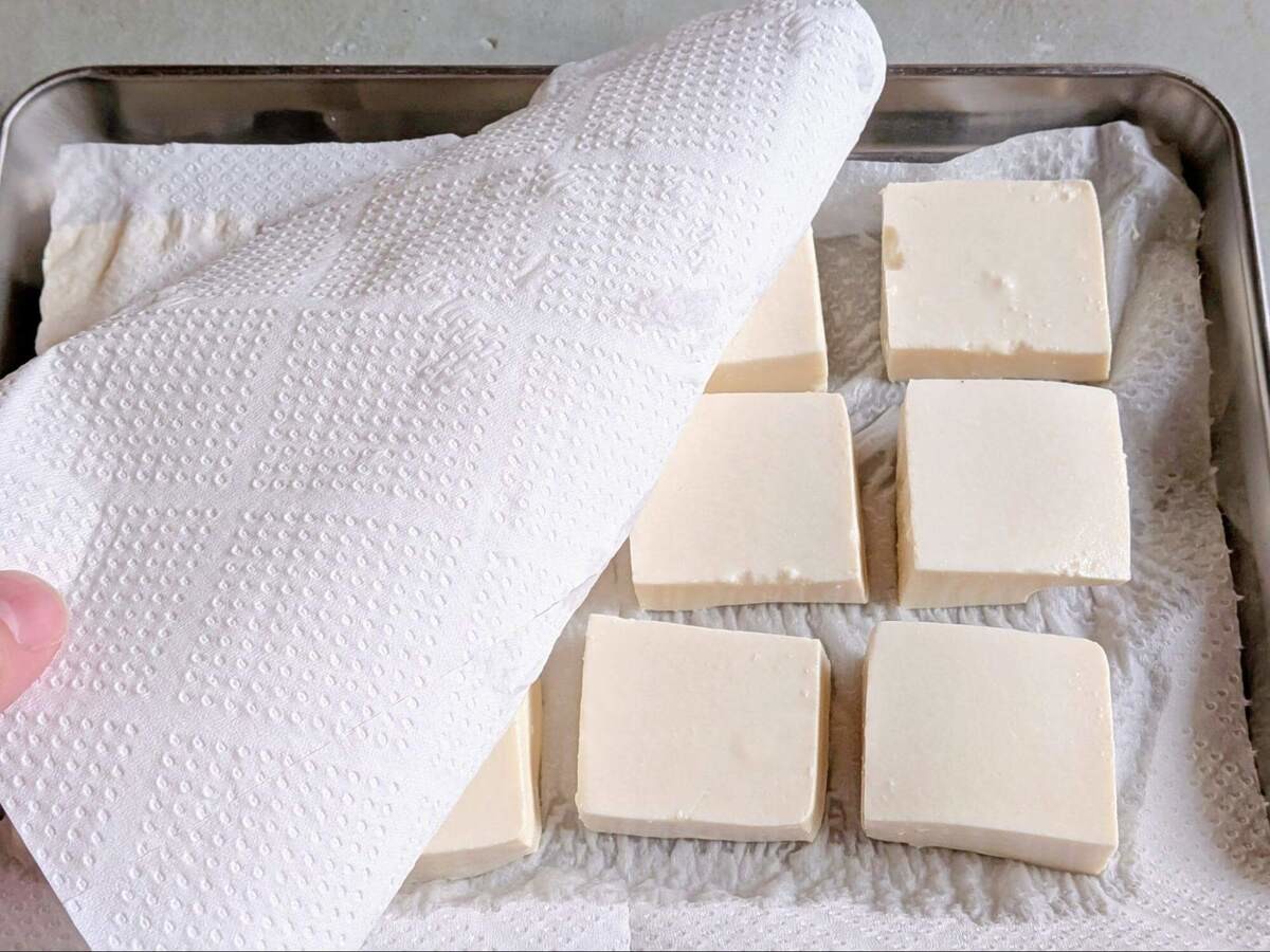 ①の豆腐をキッチンペーパーではさんで、重しをのせて約5分おきます。